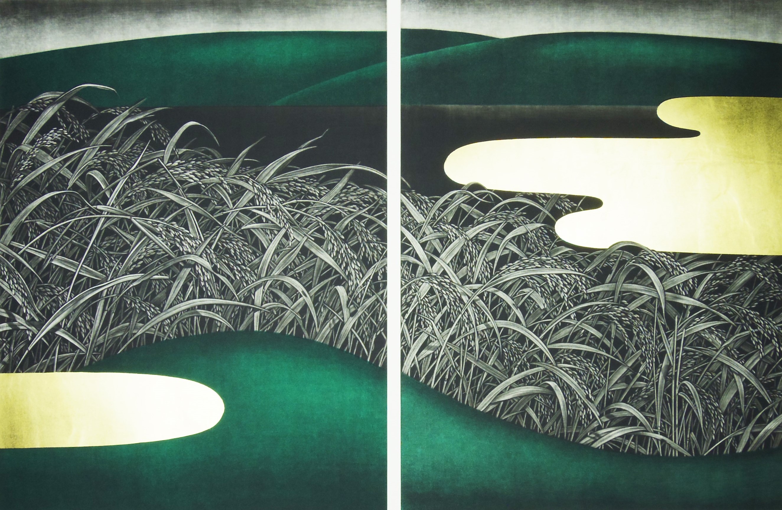 Hamanishi’s early prints depict sculptural models that the artist often created using various objects like roof tiles tied with fabric which shows the artist’s virtuosity with the medium. Some of his abstracts combine micro and macro views of rice grains and rice paddies punctuated with gorgeous and vivid colors. His more recent work incorporates traditional Japanese themes and aesthetics such as the kimono and stylized views of nature made opulent with various techniques of adding gold leaf, silver, and mica.